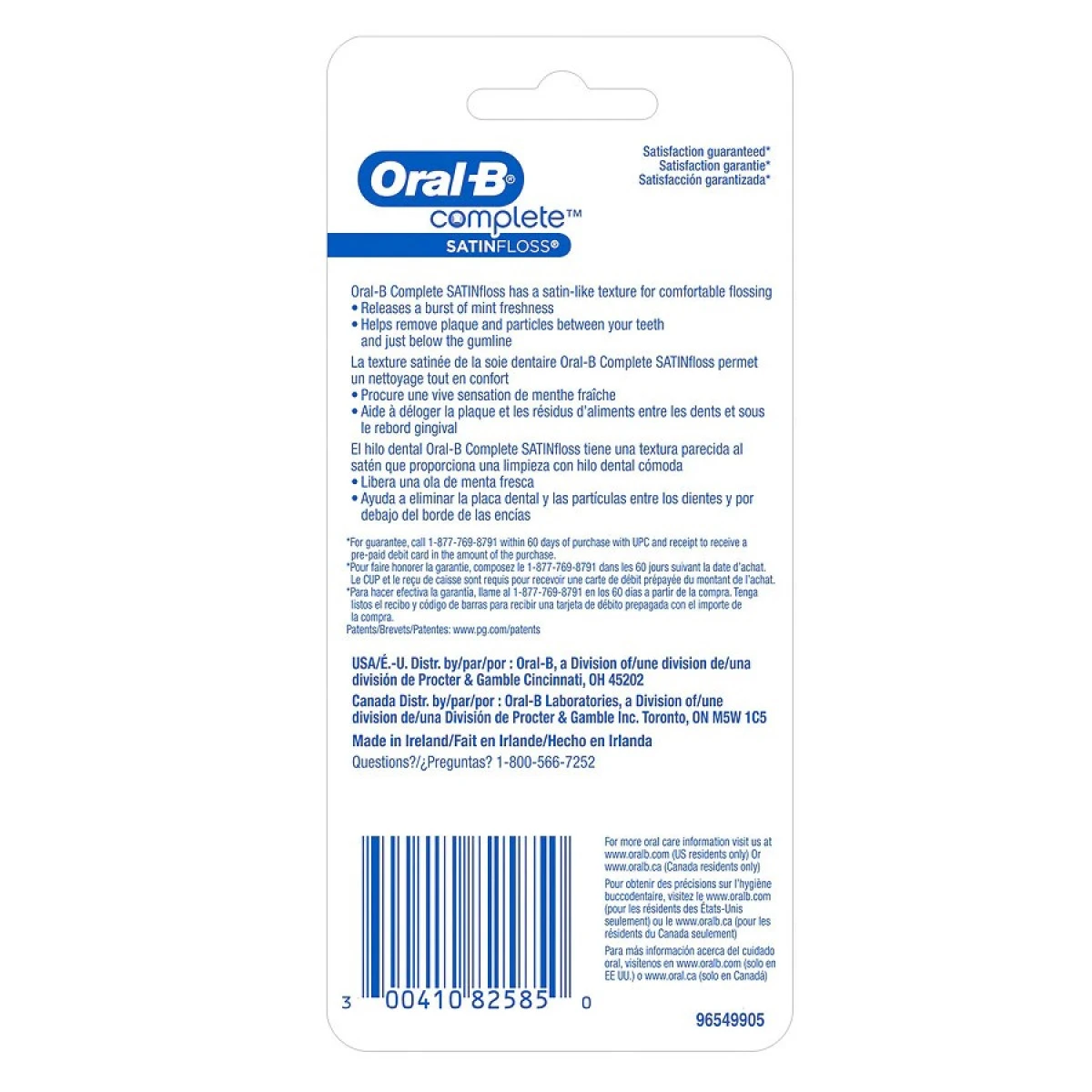 Oral-B Complete Satin Floss has a satin-like texture for comfortable flossing that helps remove plaque and particles between your teeth and just below the gum line. For guarantee, call 1-877-769-8791 within 60 days of purchase with UPC and receipt.