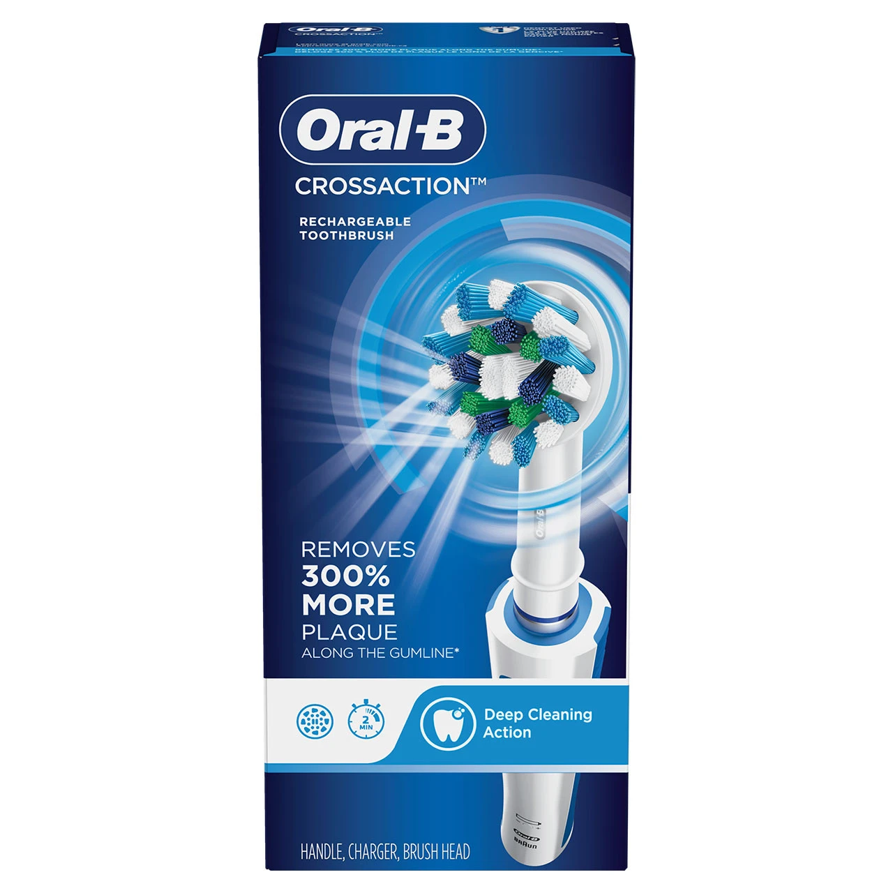 The Oral-B Cross Action rechargeable toothbrush provides a clinically proven superior clean vs. a regular manual toothbrush. The professionally inspired design of the CrossAction brush head surrounds each tooth with bristles angled at 16 degrees, and 3D cleaning action oscillates, rotates, and pulsates to break up and remove up to 300% more plaque along the gumline than a regular manual toothbrush. The pressure sensor stops pulsations if you brush too hard to prevent harmful over-brushing and there is 1 mode, plus an in-handle timer to help you brush for a dentist-recommended 2 minutes.