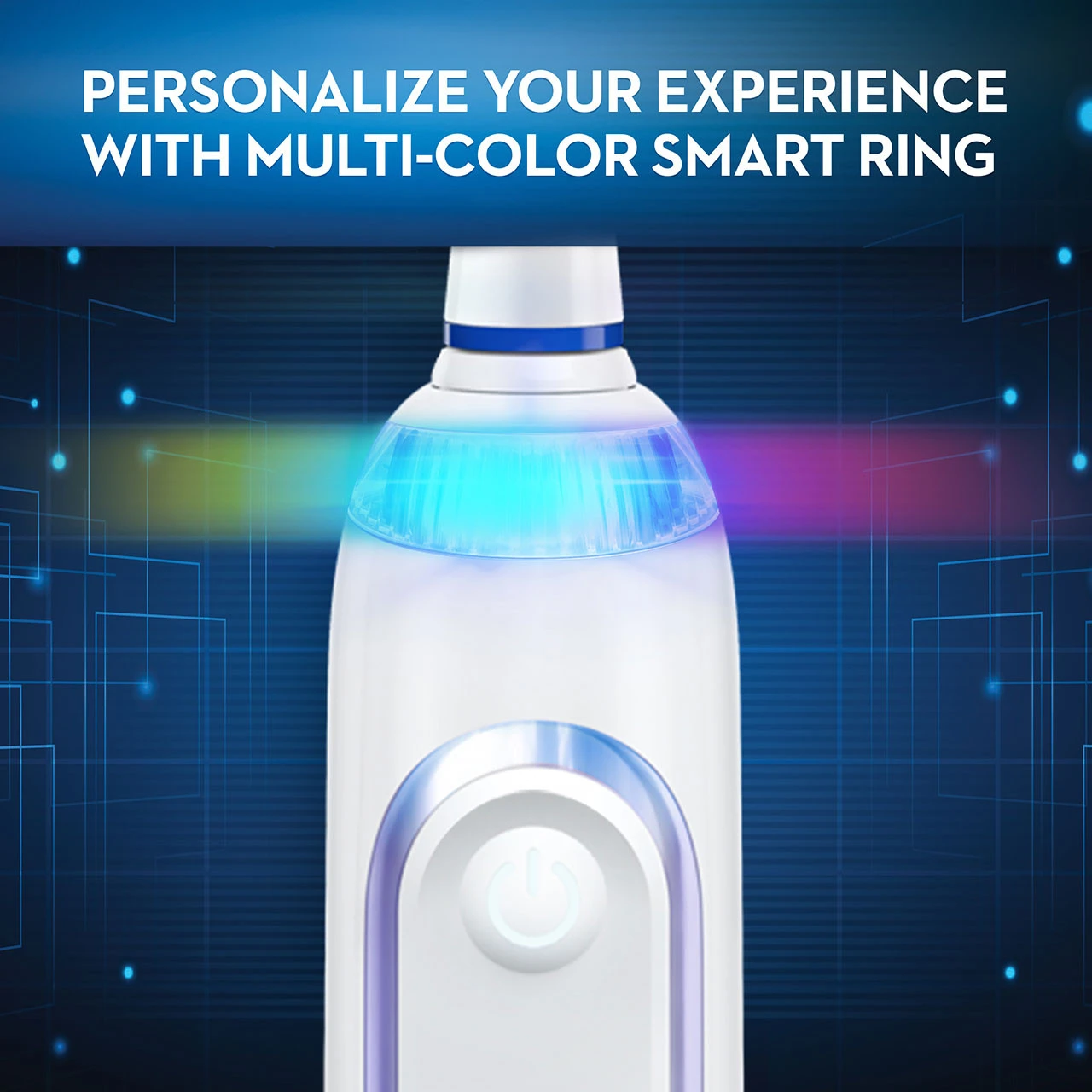 Customizable SmartRing. Personalized Experience. Elevate your custom cleaning experience with the multifunctional 360º SmartRing. Visible from every angle while brushing, the SmartRing allows you to see feedback from the pressure sensor, brushing timer and Bluetooth connection with ease. It can also be programmed through the Oral-B smartphone app to illuminate with your choice of 12 colors as you brush.