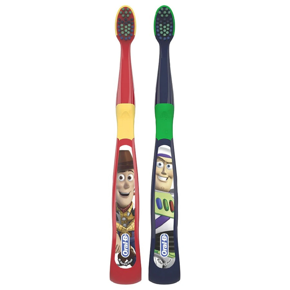 Toothbrush with a cushioned brush head designed to help protect tender gums. Tongue Cleaner is designed to promote fresh breath. Power Tip bristles designed to help clean hard-to-reach back teeth. Handle Stabilizer helps keep the toothbrush steady when set down. Makes brushing fun by featuring Disney Pixar Toy Story. Use with Crest Kids Toothpaste featuring Disney Pixar’s Toy Story. Use with the Disney Magic Timer App by Oral-B to help kids brush up to 2x longer.