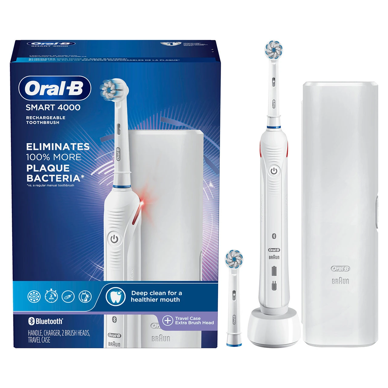 The Oral-B Smart 4000 Electric Rechargeable Power Toothbrush whitens teeth starting from day 1 by removing surface stains. Bluetooth technology connects your electric toothbrush to the Oral-B App for personalized brushing routines and daily monitoring. Additionally, the brush is equipped with a pressure sensor that indicates when you brush too hard, helping protect your gums. This handle comes with 3 modes: Daily Clean, Whitening & Sensitive, for a personalized experience. Trust in the precision engineering of Braun and the dental expertise of Oral-B, the #1 brand used and recommended by dentists worldwide. 100% Satisfaction Guaranteed.